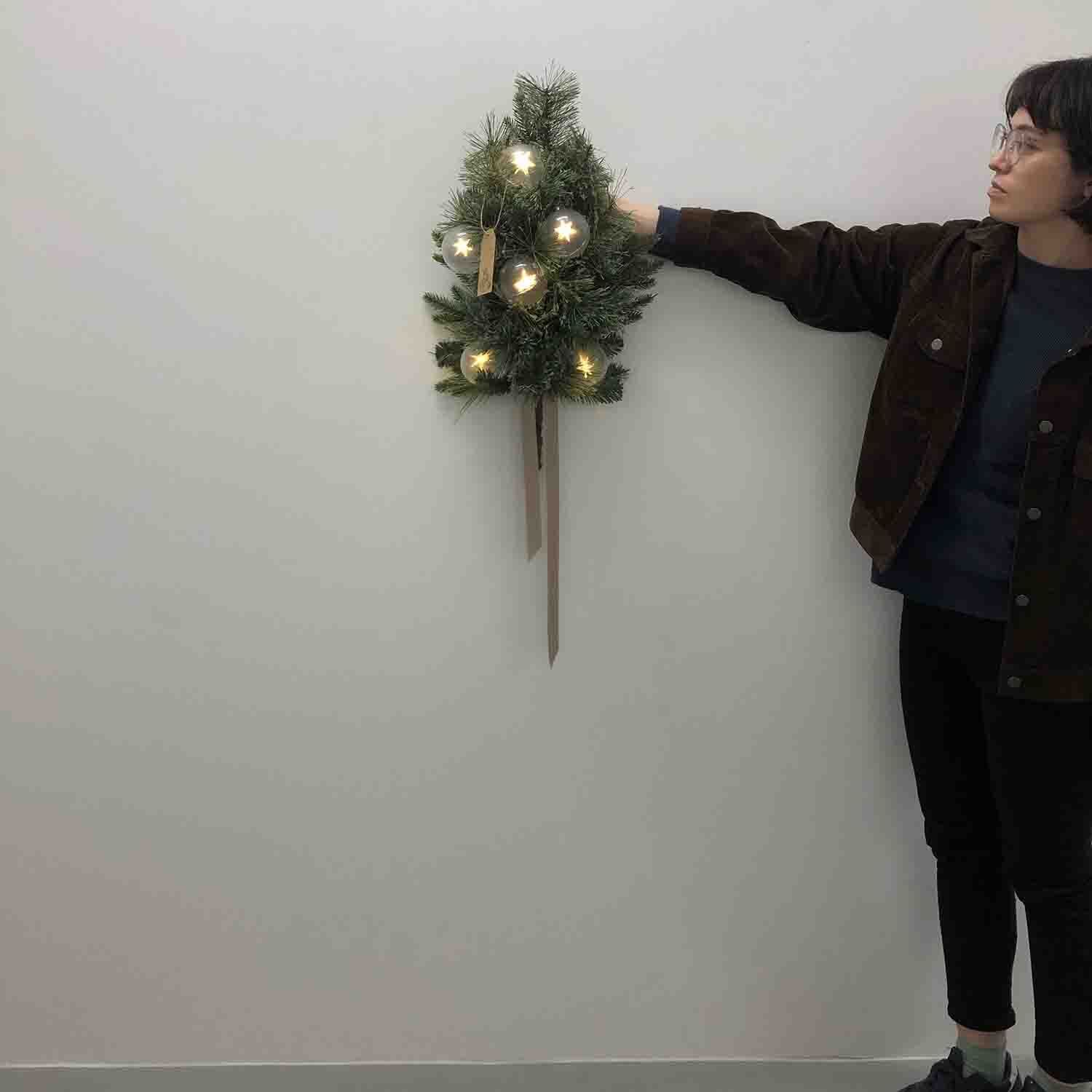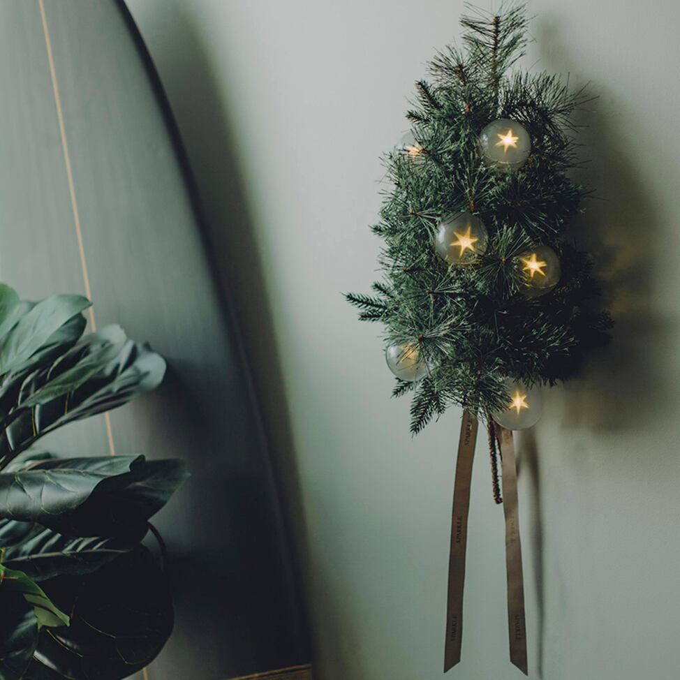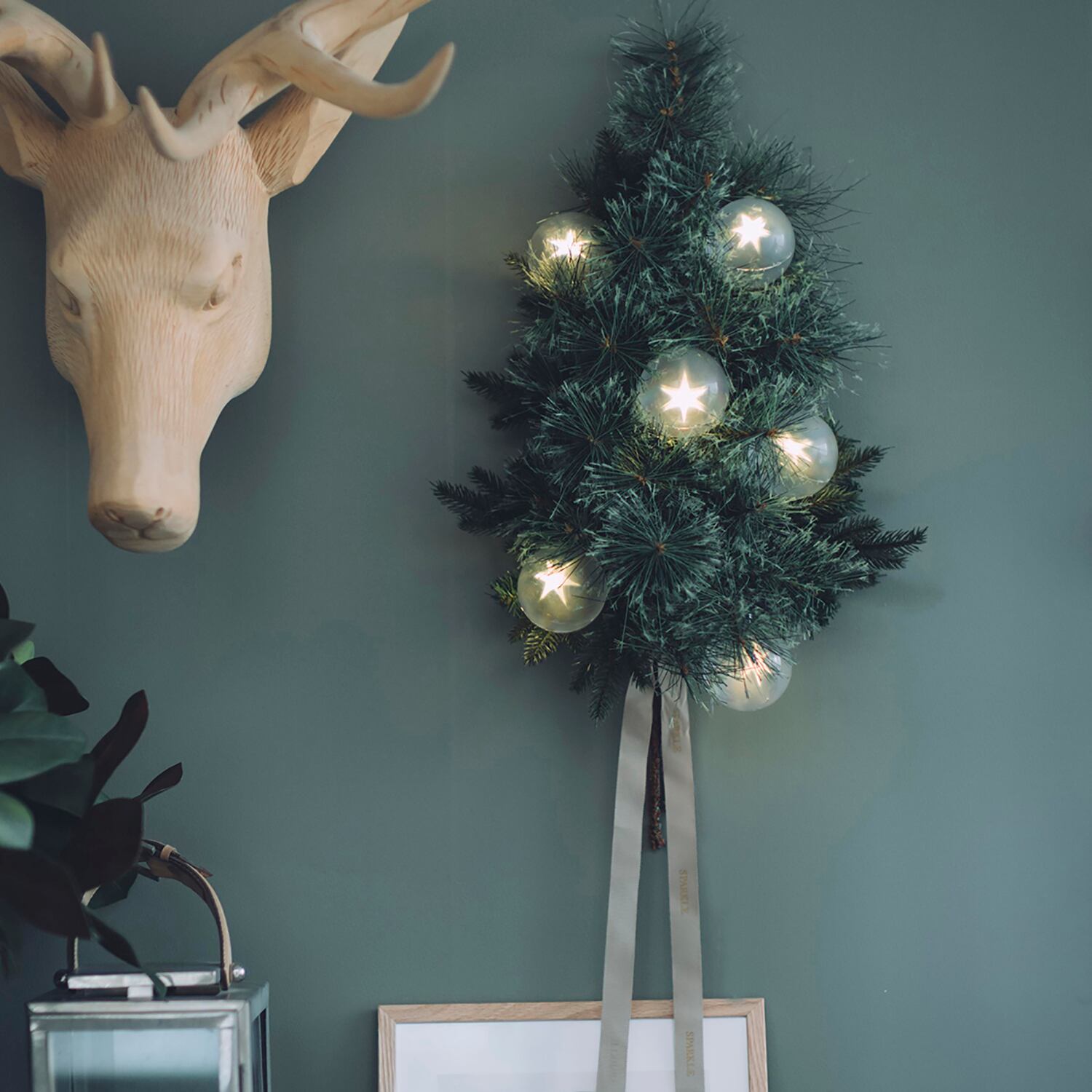 SPARKLEと高品質な2種類のモミ枝アートフラワーをアレンジし壁掛けのツリーのようにも見えるアレンジメントに仕立てました。